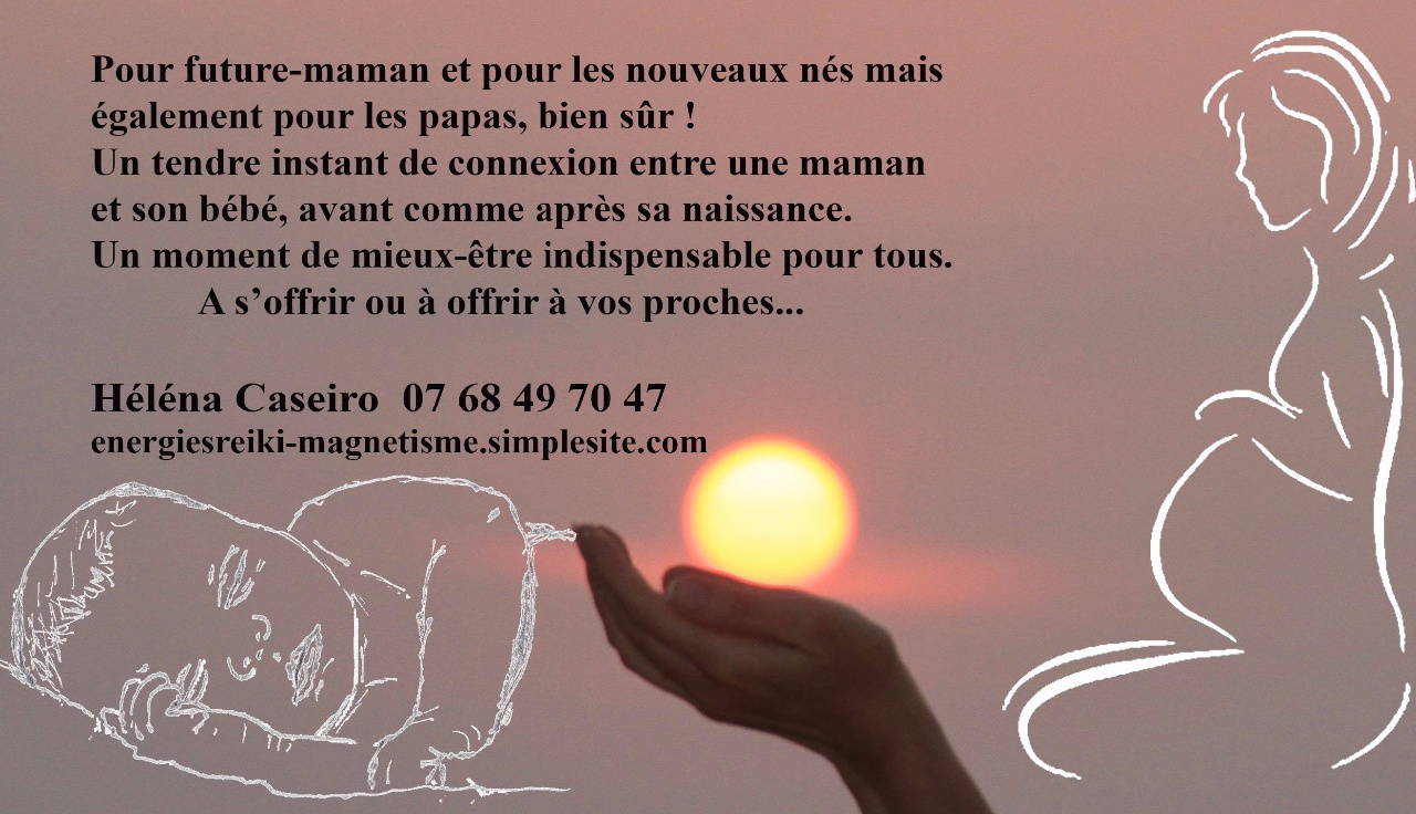 Le reiki est une technique qui permet de transmettre les energies de notre environnement et d'harmoniser,d'apaiser les énergies de nos corps. C'est donc une excellente méthode pour la santé et le bien être d'une femme enceinte et de son futur bébé, d'un nouveau né et mieux encore pour l'harmonie maman-bébé ou papa-bébé.